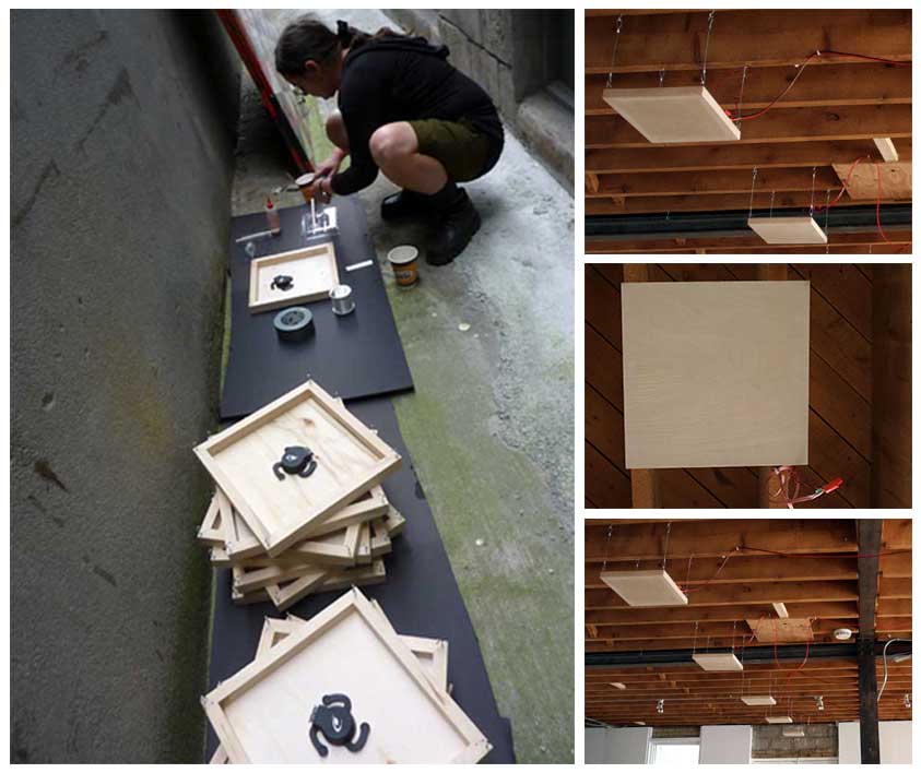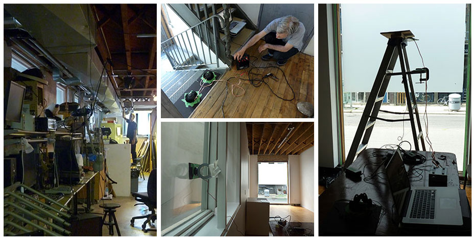The building became the material and frame for the project. We began preparing the generative audio program by using tactile transducers to feed the building sounds back through objects and surfaces in the Interaccess space.