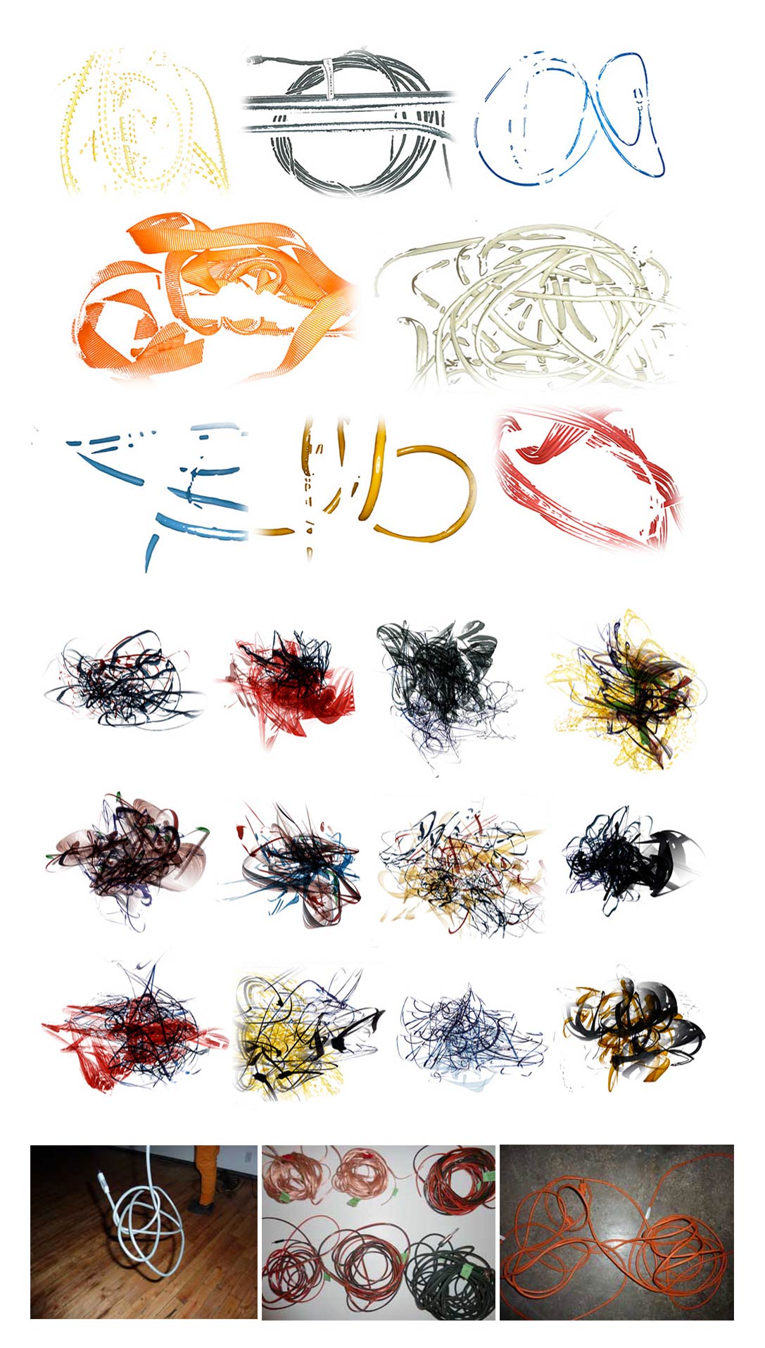 The basement workshop area at Interaccess hosts an active community of hardware hackers. We photographed the twirls and skeins of multicoloured wiring to create the generative video component.