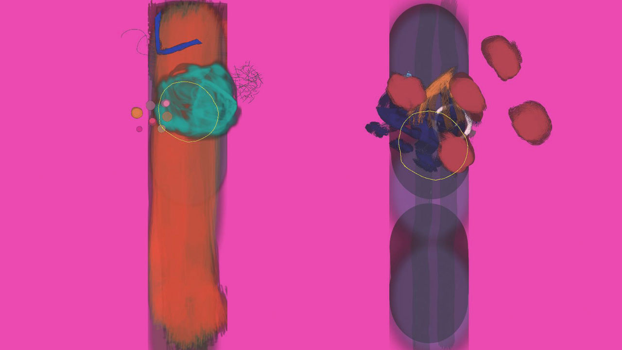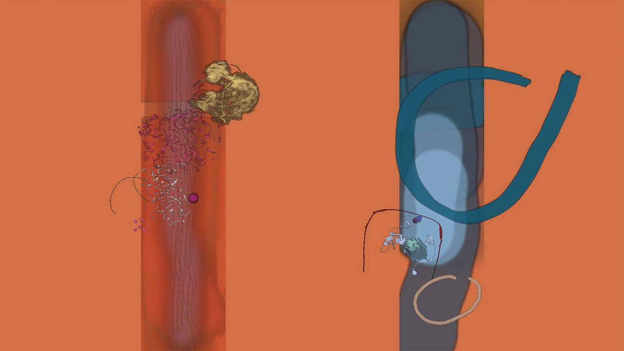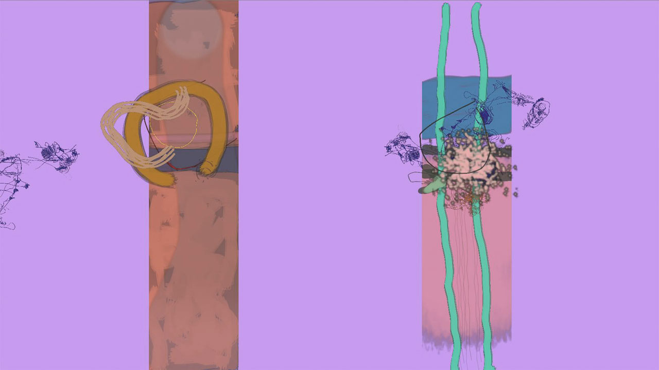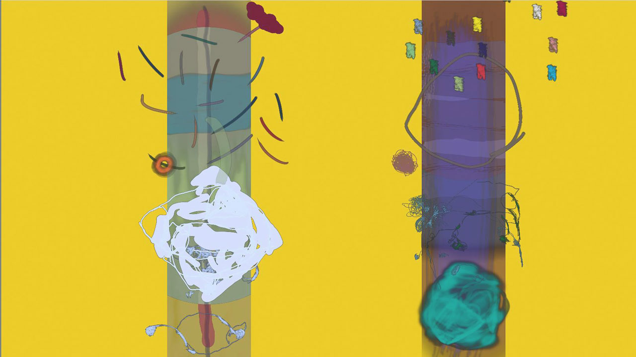 Performance for spontaneously composed sound and generative visuals. Single-channel projection, four channel sound.